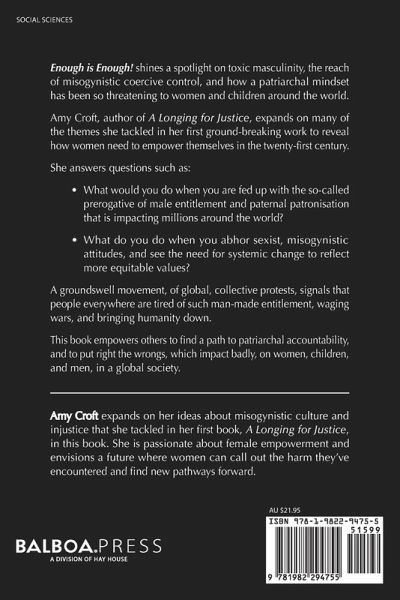 Enough is Enough! shines a spotlight on toxic masculinity, the reach of misogynistic coercive control, and how a patriarchal mindset has been so threatening to women and children around the world. Amy Croft, author of A Longing for Justice, expands on many of the themes she tackled in her first ground-breaking work to reveal how women need to empower themselves in the twenty-first century. She answers questions such as: ¿ What would you do when you are fed up with the so-called prerogative of male entitlement and paternal patronisation that is impacting millions around the world? ¿ What do you do when you abhor sexist, misogynistic attitudes, and see the need for systemic change to reflect more equitable values? A groundswell movement, of global, collective protests, signals that people everywhere are tired of such man-made entitlement, waging wars, and bringing humanity down. This book empowers others to find a path to patriarchal accountability, and to put right the wrongs, which impact badly, on women, children, and men, in a global society.