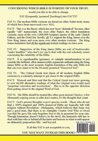 FINDING THE PRESERVED ORIGINAL BIBLE JESUS PROMISED! Believing Jesus, "...my words shall not pass away." (Mat. 24:35), Dr. Chris Sherburne makes a case for the preservation of God's Word as he compares the New King James with the King James (and seven other popular versions). Many questions are addressed in this book such as: *Where does the New King James differ from the King James? *The NKJ definitely claims to be translated from the same manuscripts as the KJ was, but are they even close? *Does it matter which version of the Bible you read? *In Matthew 5:18, was Jesus confused when he promised that every letter of Scripture would be preserved? Part I: THE FRUIT INSPECTION compares hundreds of verses. Part II: SCROLLDUGGERY examines the New King James, with its prefaces and footnotes, for faithfulness to the Originals in light of: (1) God's covenant promises to preserve His Word; (2) the readings of 98% of the Manuscripts (including most of the oldest); (3) the Laws of Evidence. Dr. Sherburne spent over 20 years doing research for this book. His conclusions are based on the work done by some of the best actual "textual scholars" of history (Burgon, Hoskier, Moorman, ...), who compared the 20,000+ ancient manuscripts. 98% of those manuscripts support the text used in the 1611 King James. This true "Majority Text" has to be the promised preserved Bible-refined seven times, as prophesied in Psalm 12:6-or there isn't one! See if this book doesn't make a defensible case for a preserved inerrant Bible. Dr. Sherburne also has these works to help the student study this issue: 1. Syllabus for an undergraduate level study of the Enough 2. Syllabus for a graduate level study of Dean John Burgon's book, Revision Revised 3. Micro Strong's Exhaustive Concordance-6" x 9" x ¿", with tabs and streamlined main concordance 4. KJ2011-King James Bible with 21st century spelling, but no textual changes 5. "Tour Guide to the Tribulation"-End times Timeline soundly and literally based on the book of Revelation and the seven Jewish feasts 6. "La Gran Aventura": A Spanish translation of "The MFJ Bible Fellowship" exceptional daily devotionals of the Gospel of John For 2 or more copies of the Enough please call (928) 927-5217; e-mail: chris.sherburne@tbuworldwide.com ; web: www.armoredsheep.com