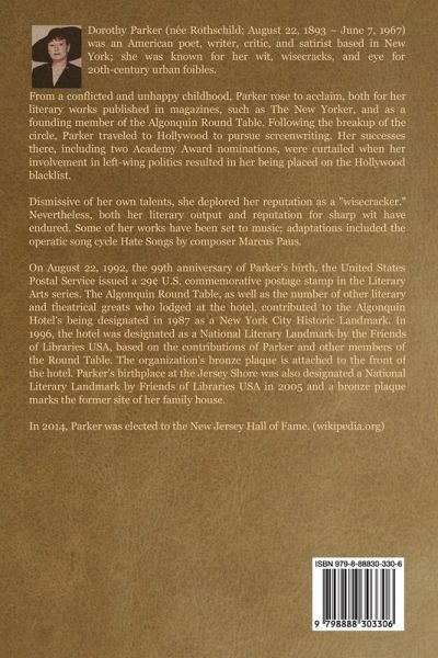 Dorothy Parker (née Rothschild; August 22, 1893 - June 7, 1967) was an American poet, writer, critic, and satirist based in New York; she was known for her wit, wisecracks, and eye for 20th-century urban foibles. From a conflicted and unhappy childhood, Parker rose to acclaim, both for her literary works published in magazines, such as The New Yorker, and as a founding member of the Algonquin Round Table. Following the breakup of the circle, Parker traveled to Hollywood to pursue screenwriting. Her successes there, including two Academy Award nominations, were curtailed when her involvement in left-wing politics resulted in her being placed on the Hollywood blacklist. Dismissive of her own talents, she deplored her reputation as a "wisecracker." Nevertheless, both her literary output and reputation for sharp wit have endured. Some of her works have been set to music; adaptations included the operatic song cycle Hate Songs by composer Marcus Paus. Parker inspired a number of fictional characters in several plays of her day. These included "Lily Malone" in Philip Barry's Hotel Universe (1932), "Mary Hilliard" (played by Ruth Gordon) in George Oppenheimer's Here Today (1932), "Paula Wharton" in Gordon's 1944 play Over Twenty-one (directed by George S. Kaufman), and "Julia Glenn" in the Kaufman-Moss Hart collaboration Merrily We Roll Along (1934). Kaufman's representation of her in Merrily We Roll Along led Parker, once his Round Table compatriot, to despise him. She also was portrayed as "Daisy Lester" in Charles Brackett's 1934 novel Entirely Surrounded. She is mentioned in the original introductory lyrics in Cole Porter's song "Just One of Those Things" from the 1935 Broadway musical Jubilee, which have been retained in the standard interpretation of the song as part of the Great American Songbook. Prince released "The Ballad of Dorothy Parker" in 1987; it was the first song recorded in his Chanhassen, Minnesota studio home. Those closest to him at the time suggest the association between the poet and the waitress by the same name in the song is a coincidence, but Dorothy Parker died on Prince's 9th birthday and chances are this brought her to his attention prior to writing the song. Parker is featured as a character in the novel The Dorothy Parker Murder Case by George Baxt (1984), in a series of Algonquin Round Table Mysteries by J. J. Murphy (2011- ), and in Ellen Meister's novel Farewell, Dorothy Parker (2013). She is the main character in "Love For Miss Dottie", a short story by Larry N Mayer, which was selected by writer Mary Gaitskill for the collection Best New American Voices 2009 (Harcourt). She has been portrayed on film and television by Dolores Sutton in F. Scott Fitzgerald in Hollywood (1976), Rosemary Murphy in Julia (1977), Bebe Neuwirth in Dash and Lilly (1999), and Jennifer Jason Leigh in Mrs. Parker and the Vicious Circle (1994). Neuwirth was nominated for an Emmy Award for her performance, and Leigh received a number of awards and nominations, including a Golden Globe nomination. The Wild Colonials song, "Vicious Circle" from Life As We Know It EP (2007) is about Dorothy Parker. The chorus lyrics are, "I know how Dorothy Parker felt with someone in her way." Television creator Amy Sherman-Palladino named her production company 'Dorothy Parker Drank Here Productions' in tribute to Parker. Tucson actress Lesley Abrams wrote and performed the one-woman show Dorothy Parker's Last Call in 2009 in Tucson, Arizona at the Winding Road Theater Ensemble. She reprised the role at the Live Theatre Workshop in Tucson in 2014. The play was selected to be part of the Capital Fringe Festival in DC in 2010. ...(wikipedia.org)
