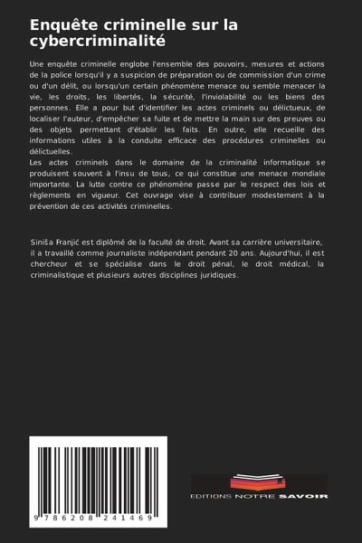 Une enquête criminelle englobe l'ensemble des pouvoirs, mesures et actions de la police lorsqu'il y a suspicion de préparation ou de commission d'un crime ou d'un délit, ou lorsqu'un certain phénomène menace ou semble menacer la vie, les droits, les libertés, la sécurité, l'inviolabilité ou les biens des personnes. Elle a pour but d'identifier les actes criminels ou délictueux, de localiser l'auteur, d'empêcher sa fuite et de mettre la main sur des preuves ou des objets permettant d'établir les faits. En outre, elle recueille des informations utiles à la conduite efficace des procédures criminelles ou délictuelles.Les actes criminels dans le domaine de la criminalité informatique se produisent souvent à l'insu de tous, ce qui constitue une menace mondiale importante. La lutte contre ce phénomène passe par le respect des lois et règlements en vigueur. Cet ouvrage vise à contribuer modestement à la prévention de ces activités criminelles.