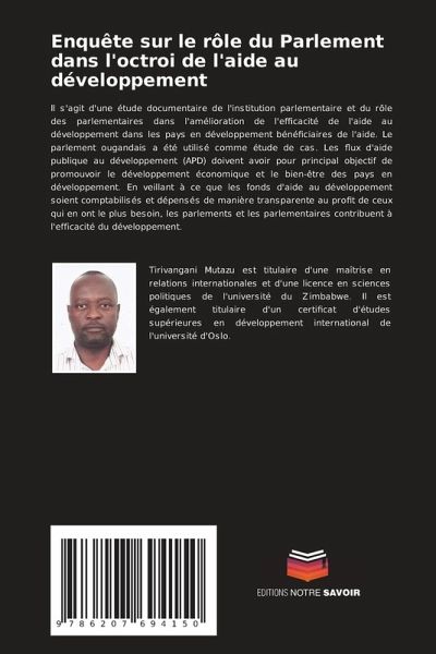 Il s'agit d'une étude documentaire de l'institution parlementaire et du rôle des parlementaires dans l'amélioration de l'efficacité de l'aide au développement dans les pays en développement bénéficiaires de l'aide. Le parlement ougandais a été utilisé comme étude de cas. Les flux d'aide publique au développement (APD) doivent avoir pour principal objectif de promouvoir le développement économique et le bien-être des pays en développement. En veillant à ce que les fonds d'aide au développement soient comptabilisés et dépensés de manière transparente au profit de ceux qui en ont le plus besoin, les parlements et les parlementaires contribuent à l'efficacité du développement.