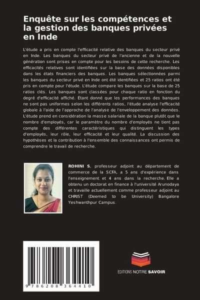 L'étude a pris en compte l'efficacité relative des banques du secteur privé en Inde. Les banques du secteur privé de l'ancienne et de la nouvelle génération sont prises en compte pour les besoins de cette recherche. Les efficacités relatives sont identifiées sur la base des données disponibles dans les états financiers des banques. Les banques sélectionnées parmi les banques du secteur privé en Inde ont été identifiées et 25 ratios ont été pris en compte pour l'étude. L'étude compare les banques sur la base de 25 ratios clés. Les banques sont classées pour chaque ratio en fonction du degré d'efficacité affiché. Étant donné que les performances des banques ne sont pas uniformes selon les différents ratios, l'étude analyse l'efficacité globale à l'aide de l'approche de l'analyse de l'enveloppement des données. L'étude prend en considération la masse salariale de la banque plutôt que le nombre d'employés, car le paramètre du nombre d'employés ne tient pas compte des différentes caractéristiques qui distinguent les types d'employés, leur rôle, leur efficacité et leur qualité. La discussion des hypothèses et la contribution à l'ensemble des connaissances ont permis de comprendre le travail de recherche.