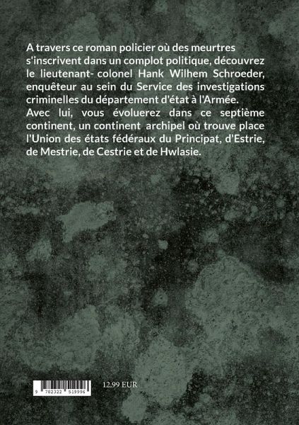 A travers ce roman policier où des meurtres s'inscrivent dans un complot politique, découvrez le lieutenant-colonel Hank Wilhem Schroeder, enquêteur au sein du Service des investigations criminelles du département d'état à l'Armée. Avec lui, vous évoluerez dans ce septième continent, un continent archipel où trouvent place l'Union des états fédéraux du Principat, d'Estrie, de Mestrie, de Cestrie et de Hwlasie.