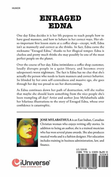One day Edna decides it is her life purpose to teach people how to have good manners, and how to behave in her correct ways. Her oh-so-important first lesson starts at a coffee shop?except, well, Edna isn?t as mannerly and correct as she thinks. In fact, Edna earns the nickname ?Enraged Edna,? thanks to her illogical temper. Edna is clueless and pretty much thinks she may possibly be one of the most perfect people on the planet. Over the course of her day, Edna intimidates a coffee shop customer, loudly disrupts people in a quiet library, and becomes every salesperson?s worst nightmare. The fact is Edna has no clue that she?s actually the person who needs to learn manners and correct behavior. So blinded by her own self-centredness and massive ego, she goes through her day too proud to see her shortcomings. As Edna continues down her path of destruction, will she realize that maybe she should learn something from the nice people she?s been trampling all day? Artist and author Jose Mylabathula adds her hilarious illustrations to the story of Enraged Edna, whose over confidence is catastrophic.