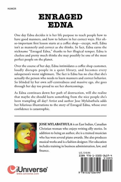 One day Edna decides it is her life purpose to teach people how to have good manners, and how to behave in her correct ways. Her oh-so-important first lesson starts at a coffee shop?except, well, Edna isn?t as mannerly and correct as she thinks. In fact, Edna earns the nickname ?Enraged Edna,? thanks to her illogical temper. Edna is clueless and pretty much thinks she may possibly be one of the most perfect people on the planet. Over the course of her day, Edna intimidates a coffee shop customer, loudly disrupts people in a quiet library, and becomes every salesperson?s worst nightmare. The fact is Edna has no clue that she?s actually the person who needs to learn manners and correct behavior. So blinded by her own self-centredness and massive ego, she goes through her day too proud to see her shortcomings. As Edna continues down her path of destruction, will she realize that maybe she should learn something from the nice people she?s been trampling all day? Artist and author Jose Mylabathula adds her hilarious illustrations to the story of Enraged Edna, whose over confidence is catastrophic.