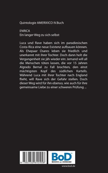 Quintologie AMERIXICO IV.BuchENRICAEin langer Weg zu sich selbstLuca und Rave haben sich im paradiesischen Costa-Rica eine neue Existenz aufbauen können. Als Ehepaar Osares leben sie friedlich und unerkannt mit ihrer Tochter. Doch dann holt die Vergangenheit sie jäh wieder ein: Jemand will all die Menschen töten lassen, die vor 15 Jahren Algrado Bernal zu Fall brachten, den einst mächtigsten Kopf des südlichen Kartells. Während Luca mit ihrer Tochter nach England flieht, will Rave sich der Gefahr stellen. Doch dieser Weg wird für ihn ebenso, wie auch für ihre gemeinsame Liebe zu einer schweren Prüfung ...