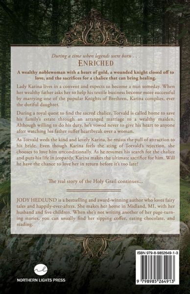 During a time when legends were born . . . ENRICHED A wealthy noblewoman with a heart of gold, a wounded knight closed off to love, and the sacrifices for a chalice that can bring healing. Lady Karina lives in a convent and expects to become a nun someday. When her wealthy father asks her to help his textile business become more successful by marrying one of the popular Knights of Brethren, Karina complies, ever the dutiful daughter. During a royal quest to find the sacred chalice, Torvald is called home to save his family's estate through an arranged marriage to a wealthy maiden. Although willing to do his duty, he's vowed never to give his heart to anyone after watching his father suffer heartbreak over a woman. As Torvald weds the kind and lovely Karina, he resists the pull of attraction to his bride. Even though Karina feels the sting of Torvald's rejection, she chooses to love him unconditionally. As he resumes his search for the chalice and puts his life in jeopardy, Karina makes the ultimate sacrifice for him. Will he have the chance to love her in return before it's too late? The real story of the Holy Grail continues . . .