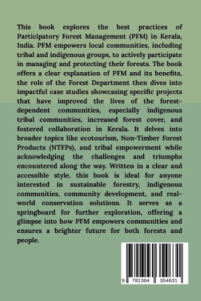 This book explores the best practices of Participatory Forest Management (PFM) in Kerala, India. PFM empowers local communities, including tribal and indigenous groups, to actively participate in managing and protecting their forests. The book offers a clear explanation of PFM and its benefits, the role of the Forest Department then dives into impactful case studies showcasing specific projects that have improved the lives of the forest-dependent communities, especially indigenous tribal communities, increased forest cover, and fostered collaboration in Kerala. It delves into broader topics like ecotourism, Non-Timber Forest Products (NTFPs), and tribal empowerment while acknowledging the challenges and triumphs encountered along the way. Written in a clear and accessible style, this book is ideal for anyone interested in sustainable forestry, indigenous communities, community development, and real-world conservation solutions. It serves as a springboard for further exploration, offering a glimpse into how PFM empowers communities and ensures a brighter future for both forests and people.