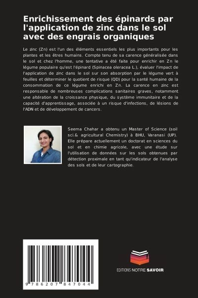 Le zinc (Zn) est l'un des éléments essentiels les plus importants pour les plantes et les êtres humains. Compte tenu de sa carence généralisée dans le sol et chez l'homme, une tentative a été faite pour enrichir en Zn le légume populaire qu'est l'épinard (Spinacea oleracea L.), évaluer l'impact de l'application de zinc dans le sol sur son absorption par le légume vert à feuilles et déterminer le quotient de risque (QD) pour la santé humaine de la consommation de ce légume enrichi en Zn. La carence en zinc est responsable de nombreuses complications sanitaires graves, notamment une altération de la croissance physique, du système immunitaire et de la capacité d'apprentissage, associée à un risque d'infections, de lésions de l'ADN et de développement de cancers.