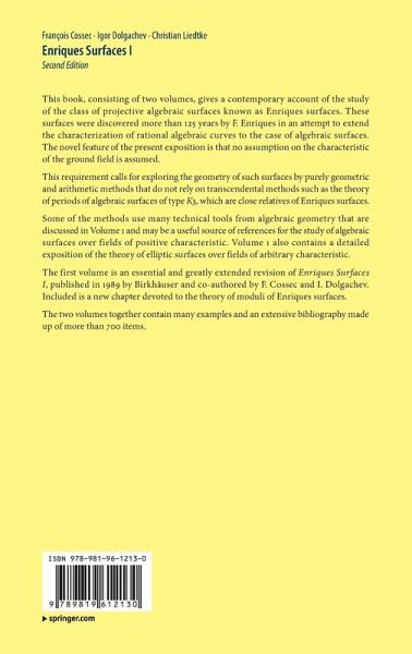 The first volume is an essential and greatly extended revision of Enriques Surfaces I, published in 1989 by Birkhäuser and co-authored by F. Cossec and I. Dolgachev. Included is a new chapter devoted to the theory of moduli of Enriques surfaces.