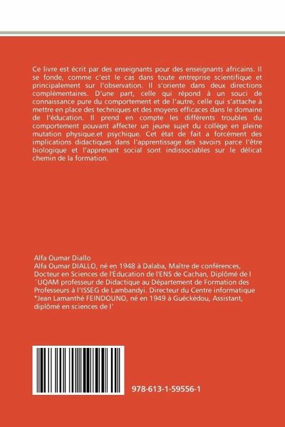 Ce livre est écrit par des enseignants pour des enseignants africains. Il se fonde, comme c'est le cas dans toute entreprise scientifique et principalement sur l'observation. Il s'oriente dans deux directions complémentaires. D'une part, celle qui répond à un souci de connaissance pure du comportement et de l'autre, celle qui s'attache à mettre en place des techniques et des moyens efficaces dans le domaine de l'éducation. Il prend en compte les différents troubles du comportement pouvant affecter un jeune sujet du collège en pleine mutation physique.et psychique. Cet état de fait a forcément des implications didactiques dans l'apprentissage des savoirs parce l'être biologique et l'apprenant social sont indissociables sur le délicat chemin de la formation.