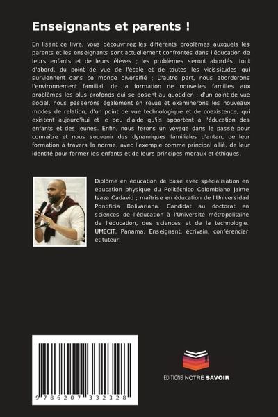 En lisant ce livre, vous découvrirez les différents problèmes auxquels les parents et les enseignants sont actuellement confrontés dans l'éducation de leurs enfants et de leurs élèves ; les problèmes seront abordés, tout d'abord, du point de vue de l'école et de toutes les vicissitudes qui surviennent dans ce monde diversifié ; D'autre part, nous aborderons l'environnement familial, de la formation de nouvelles familles aux problèmes les plus profonds qui se posent au quotidien ; d'un point de vue social, nous passerons également en revue et examinerons les nouveaux modes de relation, d'un point de vue technologique et de coexistence, qui existent aujourd'hui et le peu d'aide qu'ils apportent à l'éducation des enfants et des jeunes. Enfin, nous ferons un voyage dans le passé pour connaître et nous souvenir des dynamiques familiales d'antan, de leur formation à travers la norme, avec l'exemple comme principal allié, de leur identité pour former les enfants et de leurs principes moraux et éthiques.