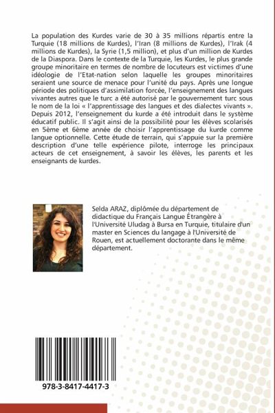 La population des Kurdes varie de 30 à 35 millions répartis entre la Turquie (18 millions de Kurdes), l'Iran (8 millions de Kurdes), l'Irak (4 millions de Kurdes), la Syrie (1,5 million), et plus d'un million de Kurdes de la Diaspora. Dans le contexte de la Turquie, les Kurdes, le plus grande groupe minoritaire en termes de nombre de locuteurs est victimes d'une idéologie de l'Etat-nation selon laquelle les groupes minoritaires seraient une source de menace pour l'unité du pays. Après une longue période des politiques d'assimilation forcée, l'enseignement des langues vivantes autres que le turc a été autorisé par le gouvernement turc sous le nom de la loi " l'apprentissage des langues et des dialectes vivants ". Depuis 2012, l'enseignement du kurde a été introduit dans le système éducatif public. Il s'agit ainsi de la possibilité pour les élèves scolarisés en 5ème et 6ème année de choisir l'apprentissage du kurde comme langue optionnelle. Cette étude de terrain, qui s'appuie sur la première description d'une telle expérience pilote, interroge les principaux acteurs de cet enseignement, à savoir les élèves, les parents et les enseignants de kurdes.