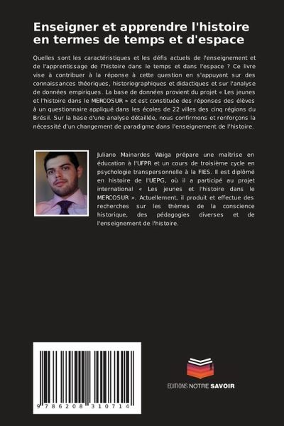 Quelles sont les caractéristiques et les défis actuels de l'enseignement et de l'apprentissage de l'histoire dans le temps et dans l'espace ? Ce livre vise à contribuer à la réponse à cette question en s'appuyant sur des connaissances théoriques, historiographiques et didactiques et sur l'analyse de données empiriques. La base de données provient du projet « Les jeunes et l'histoire dans le MERCOSUR » et est constituée des réponses des élèves à un questionnaire appliqué dans les écoles de 22 villes des cinq régions du Brésil. Sur la base d'une analyse détaillée, nous confirmons et renforçons la nécessité d'un changement de paradigme dans l'enseignement de l'histoire.