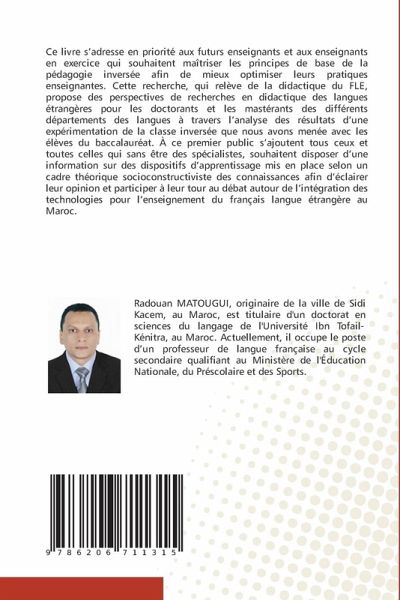 Ce livre s'adresse en priorité aux futurs enseignants et aux enseignants en exercice qui souhaitent maîtriser les principes de base de la pédagogie inversée afin de mieux optimiser leurs pratiques enseignantes. Cette recherche, qui relève de la didactique du FLE, propose des perspectives de recherches en didactique des langues étrangères pour les doctorants et les mastérants des différents départements des langues à travers l'analyse des résultats d'une expérimentation de la classe inversée que nous avons menée avec les élèves du baccalauréat. À ce premier public s'ajoutent tous ceux et toutes celles qui sans être des spécialistes, souhaitent disposer d'une information sur des dispositifs d'apprentissage mis en place selon un cadre théorique socioconstructiviste des connaissances afin d'éclairer leur opinion et participer à leur tour au débat autour de l'intégration des technologies pour l'enseignement du français langue étrangère au Maroc.