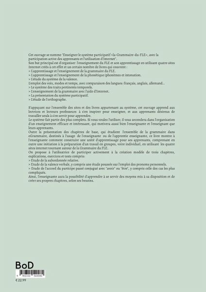 Cet ouvrage se nomme "Enseigner le système participatif , avec la participation active des apprenants et l'utilisation d'Internet".Son but principal est d'organiser l'enseignement du FLE et son apprentissage en utilisant quatre sites Internet créés à cet effet et un certain nombre de livres qui couvrent :> L'apprentissage et l'enseignement de la grammaire du FLE.> L'apprentissage et l'enseignement de la phonétique (phonèmes et intonation.> L'étude du système de la valence.L'emploi des voix, modes et temps, avec comparaison des langues: français, anglais, allemand..> Le système des traits pertinents temporels.> L'enseignement de la grammaire avec l'aide d'Internet.> La présentation du système participatif.> L'étude de l'orthographe.S'appuyant sur l'ensemble des sites et des livres appartenant au système, cet ouvrage apprend aux lectrices et lecteurs professeurs à s'en inspirer pour enseigner, et aux apprenants désireux de travailler seuls à s'en servir pour apprendre.Le système fait partie des plus complets. Si vous voulez l'utiliser, il vous secondera dans l'organisation d'un enseignement efficace et intéressant, qui motivera aussi bien l'enseignante et l'enseignant que leurs apprenants.Outre la présentation des chapitres de base, qui étudient l'ensemble de la grammaire dans eGrammaire, destinés à l'usage de l'enseignante ou de l'apprentie enseignante, ce livre montre à l'enseignante comment construire une unité d'apprentissage pour ses apprenants, comprenant en outre une initiation à la préparation d'un travail en groupes, voire individuel, en utilisant les quatre sites internet tournant autour de la Grammaire du FLE.On propose à l'utilisatrice de participer activement à la création modèle de trois chapitres, explications, exercices et tests compris:> Etude de la subordonnée relative.> Etude de la valence verbale, y compris une étude poussée sur l'emploi des pronoms personnels.> Etude de l'accord du participe passé conjugué avec "avoir" ou "être", y compris celle des cas les plus compliqués.Ainsi, l'enseignante aura la possibilité d'apprendre à se servir des moyens mis à sa disposition et de créer ses propres chapitres, selon ses besoins.