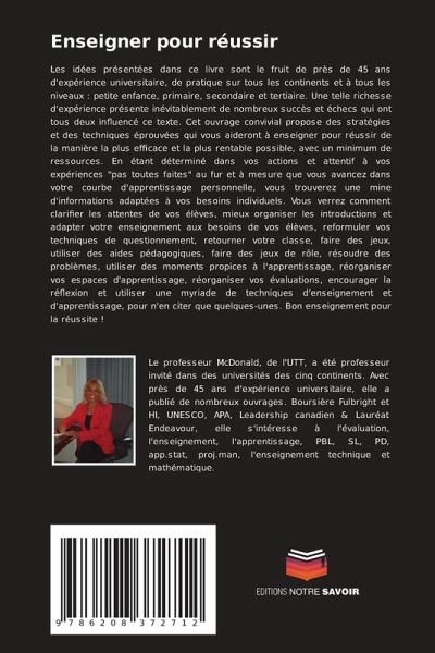 Les idées présentées dans ce livre sont le fruit de près de 45 ans d'expérience universitaire, de pratique sur tous les continents et à tous les niveaux : petite enfance, primaire, secondaire et tertiaire. Une telle richesse d'expérience présente inévitablement de nombreux succès et échecs qui ont tous deux influencé ce texte. Cet ouvrage convivial propose des stratégies et des techniques éprouvées qui vous aideront à enseigner pour réussir de la manière la plus efficace et la plus rentable possible, avec un minimum de ressources. En étant déterminé dans vos actions et attentif à vos expériences "pas toutes faites" au fur et à mesure que vous avancez dans votre courbe d'apprentissage personnelle, vous trouverez une mine d'informations adaptées à vos besoins individuels. Vous verrez comment clarifier les attentes de vos élèves, mieux organiser les introductions et adapter votre enseignement aux besoins de vos élèves, reformuler vos techniques de questionnement, retourner votre classe, faire des jeux, utiliser des aides pédagogiques, faire des jeux de rôle, résoudre des problèmes, utiliser des moments propices à l'apprentissage, réorganiser vos espaces d'apprentissage, réorganiser vos évaluations, encourager la réflexion et utiliser une myriade de techniques d'enseignement et d'apprentissage, pour n'en citer que quelques-unes. Bon enseignement pour la réussite !