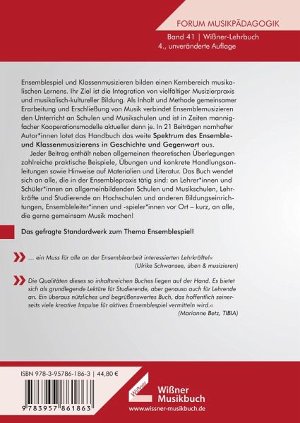 Ensemblespiel und Klassenmusizieren bilden einen Kernbereich musikalischen Lernens. Ihr Ziel ist die Integration von vielfältiger Musizierpraxis und musikalisch-kultureller Bildung. Als Inhalt und Methode gemeinsamer Erarbeitung und Erschließung von Musik verbindet Ensemblemusizieren den Ensemblespiel und Klassenmusizieren bilden einen Kernbereich musikalischen Lernens. Ihr Ziel ist die Integration von vielfältiger Musizierpraxis und musikalisch-kultureller Bildung. Als Inhalt und Methode gemeinsamer Erarbeitung und Erschließung von Musik verbindet Ensemblemusizieren den Unterricht an Schulen und Musikschulen und ist in Zeiten mannigfacher Kooperationsmodelle aktueller denn je. In 21 Beiträgen namhafter Autor(inn)en lotet das Handbuch das weite Spektrum des Ensemble- und Klassenmusizierens in Geschichte und Gegenwart aus. Jeder Beitrag enthält neben allgemeinen theoretischen Überlegungen zahlreiche praktische Beispiele, Übungen und konkrete Handlungsanleitungen sowie Hinweise aufMaterialien und Literatur. Das Buch wendet sich an alle, die in der Ensemblepraxis tätig sind: Lehrer(innen) und Schüler(innen) an allgemeinbildenden Schulen und Musikschulen, Lehrkräfte und Studierende an Hochschulen und anderen Bildungseinrichtungen, Ensembleleiter(innen) und -spieler(innen) vor Ort - kurz, an alle, die gerne gemeinsam Musik machen!