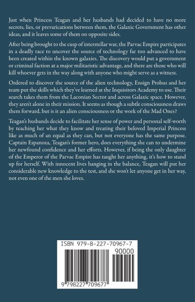 Just when Princess Teagan and her husbands had decided to have no more secrets, lies, or prevarications between them, the Galaxic Government has other ideas, and it leaves some of them on opposite sides. After being brought to the cusp of interstellar war, the Parvac Empire participates in a deadly race to uncover the source of technology far too advanced to have been created within the known galaxies. The discovery would put a government or criminal faction at a major militaristic advantage, and there are those who will kill whoever gets in the way along with anyone who might serve as a witness. Ordered to discover the source of the alien technology, Ensign Probus and her team put the skills which they've learned at the Inquisitors Academy to use. Their search takes them from the Laconian Sector and across Galaxic space. However, they aren't alone in their mission. It seems as though a subtle consciousness draws them forward, but is it an alien consciousness or the work of the Mad Ones? Teagan's husbands decide to facilitate her sense of power and personal self-worth by teaching her what they know and treating their beloved Imperial Princess like as much of an equal as they can, but not everyone has the same purpose. Captain Espanoza, Teagan's former hero, does everything she can to undermine her newfound confidence and her efforts. However, if being the only daughter of the Emperor of the Parvac Empire has taught her anything, it's how to stand up for herself. With innocent lives hanging in the balance, Teagan will put her considerable new knowledge to the test, and she won't let anyone get in her way, not even one of the men she loves.