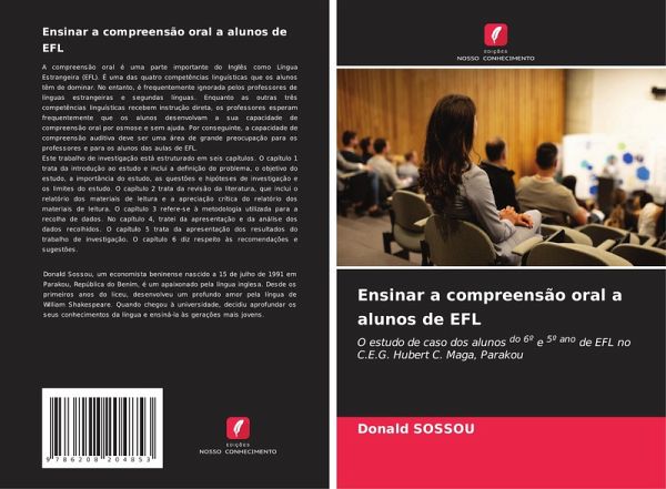 A compreensão oral é uma parte importante do Inglês como Língua Estrangeira (EFL). É uma das quatro competências linguísticas que os alunos têm de dominar. No entanto, é frequentemente ignorada pelos professores de línguas estrangeiras e segundas línguas. Enquanto as outras três competências linguísticas recebem instrução direta, os professores esperam frequentemente que os alunos desenvolvam a sua capacidade de compreensão oral por osmose e sem ajuda. Por conseguinte, a capacidade de compreensão auditiva deve ser uma área de grande preocupação para os professores e para os alunos das aulas de EFL. Este trabalho de investigação está estruturado em seis capítulos. O capítulo 1 trata da introdução ao estudo e inclui a definição do problema, o objetivo do estudo, a importância do estudo, as questões e hipóteses de investigação e os limites do estudo. O capítulo 2 trata da revisão da literatura, que inclui o relatório dos materiais de leitura e a apreciação crítica do relatório dos materiais de leitura. O capítulo 3 refere-se à metodologia utilizada para a recolha de dados. No capítulo 4, tratei da apresentação e da análise dos dados recolhidos. O capítulo 5 trata da apresentação dos resultados do trabalho de investigação. O capítulo 6 diz respeito às recomendações e sugestões.