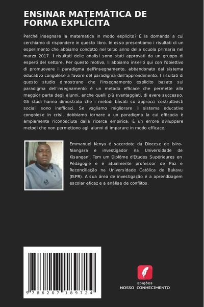 Perché insegnare la matematica in modo esplicito? È la domanda a cui cerchiamo di rispondere in questo libro. In esso presentiamo i risultati di un esperimento che abbiamo condotto nel terzo anno della scuola primaria nel marzo 2017. I risultati delle analisi sono stati approvati da un gruppo di esperti del settore. Per questo motivo, li abbiamo inseriti qui con l'obiettivo di promuovere il paradigma dell'insegnamento, abbandonato dal sistema educativo congolese a favore del paradigma dell'apprendimento. I risultati di questo studio dimostrano che l'insegnamento esplicito basato sul paradigma dell'insegnamento è un metodo efficace che permette alla maggior parte degli alunni, anche quelli più svantaggiati, di avere successo. Gli studi hanno dimostrato che i metodi basati su approcci costruttivisti sociali sono inefficaci. Se vogliamo migliorare il sistema educativo congolese in crisi, dobbiamo tornare a un paradigma la cui efficacia è ampiamente riconosciuta dalla ricerca empirica. È un errore sviluppare metodi che non permettono agli alunni di imparare in modo efficace.