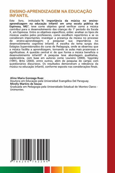 Este livro, intitulado "A importância da música no ensino-aprendizagem na educação infantil em uma escola pública de Espinosa, MG", teve como objetivo geral verificar como a música contribui para o desenvolvimento das crianças do 1° período da Escola X, em Espinosa. Entre os objetivos específicos, estão: analisar os tipos de músicas usados pelos professores, como escolhem repertórios e se os consideram importantes; investigar a presença da música no processo de ensino-aprendizagem; e pesquisar sua importância no desenvolvimento cognitivo infantil. A escolha do tema surgiu dos Estágios Supervisionados do curso de Pedagogia, onde se observou que a música facilita a aprendizagem, tornando as aulas mais prazerosas e significativas. A questão central é: de que forma a música beneficia o desenvolvimento infantil? A pesquisa teve abordagem qualitativa, exploratória, com base em autores como Loureiro (2003), Vygotsky (1991), Brito (2003), entre outros, além de pesquisa de campo com questionários discursivos. Os resultados demonstram a relevância da música na educação infantil, conforme exposto nas considerações finais.