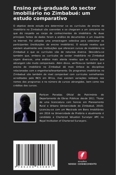 O objetivo deste estudo era determinar se os currículos do ensino do imobiliário no Zimbabué são coerentes e se chegaram a um consenso no que diz respeito ao corpo de conhecimentos do imobiliário. As duas principais fontes de dados foram a análise de documentos e um inquérito na Internet. Foi utilizada uma amostragem selectiva para selecionar os participantes (instituições de ensino imobiliário). O estudo revelou que existem atualmente seis instituições que oferecem cursos de imobiliário no Zimbabué e que os currículos são de natureza diversa. Descobriu-se também que, embora os currículos do sector imobiliário no Zimbabué sejam diversos, uma análise mais atenta revelou que os cursos que abrangem são muito comparáveis. Além disso, verificou-se também que o ensino do imobiliário no Zimbabué dá mais ênfase às disciplinas relacionadas com a engenharia/levantamento. Os programas imobiliários no Zimbabué são também de nível comparável com currículos semelhantes acreditados pelo RICS em África, mas existem variações notáveis nos nomes dos programas e no número de cursos abrangidos, bem como nos créditos dos cursos.