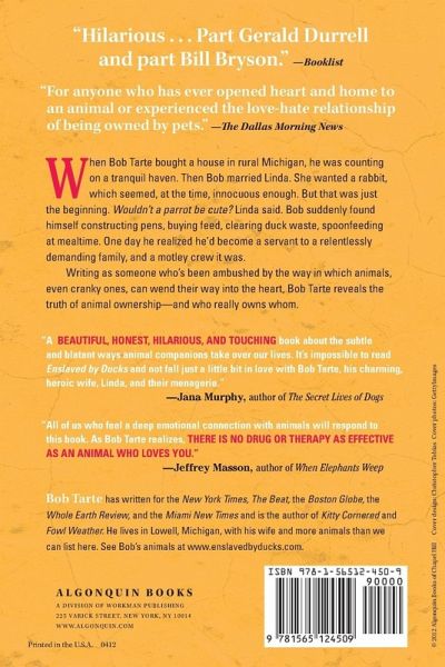 The book that Entertainment Weekly called "hilarious," Publishers Weekly declared "a true pleasure," Booklist called "heartwarming," and the Dallas Morning News praised as "rich and funny" is now available in paperback. When Bob Tarte bought a house in rural Michigan, he was counting on a tranquil haven. Then Bob married Linda. She wanted a rabbit, which seemed innocuous enough until the bunny chewed through their electrical wiring. And that was just the beginning. Before long, Bob found himself constructing cages, buying feed, clearing duck waste, and spoon-feeding a menagerie of furry and feathery residents. His life of quiet serenity vanished, and he unwittingly became a servant to a relentlessly demanding family. "They dumbfounded him, controlled and teased him, took their share of his flesh, stole his heart" (Kirkus Reviews). Whether commiserating with Bob over the fate of those who are slaves to their animals or regarding his story as a cautionary tale about the rigors of animal ownership, readers on both sides of the fence have found Tarte's story of his chaotic squawking household irresistible--and irresistibly funny.