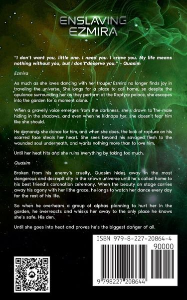 "I don't want you, little one. I need you. I crave you. My life means nothing without you, but I don't deserve you." - Quasim Ezmira As much as she loves dancing with her troupe, Ezmira no longer finds joy in traveling the universe. She longs for a place to call home, so despite the opulence surrounding her as they perform at the Raptyre palace, she escapes into the garden for a moment alone. When a gravelly voice emerges from the darkness, she's drawn to the male hiding in the shadows, and even when he kidnaps her, she doesn't fear him like she should. He demands she dance for him, and when she does, the look of rapture on his scarred face steals her heart. She sees beyond his savaged flesh to the wounded soul underneath and wants nothing more than to love him. Until her heat hits and she ruins everything by taking too much. Quasim Broken from his enemy's cruelty, Quasim hides away in the most dangerous and decrepit city in the known universe until he's called home to his best friend's coronation ceremony. When the beauty on stage carries away his agony with her lithe grace, he longs to watch her dance every day for the rest of his life. So when he overhears a group of alphas planning to hurt her in the garden, he overreacts and whisks her away to the only place he knows she's safe. His den. Until she goes into heat and proves he's the biggest danger of all. Enslaving Ezmira (Sci-Fi Fairytale Fusions Book 4) is a spicy, action-packed, heartfelt alien monster omegaverse retelling of The Hunchback of Notre Dam. Intended for 18+ readers. Please see author's website for more information. Can be read as a standalone. HEA guaranteed.