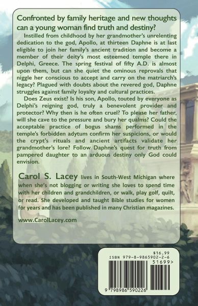 Confronted by family heritage and new thoughts can a young woman find truth and destiny? Instilled from childhood by her grandmother's unrelenting dedication to the god, Apollo, at thirteen Daphne is at last eligible to join her family's ancient tradition and become a member of their deity's most esteemed temple there in Delphi, Greece. The spring festival of fifty A.D. is almost upon them, but can she quiet the ominous reprovals that niggle her conscious to accept and carry on the matriarch's legacy? Plagued with doubts about the revered god, Daphne struggles against family loyalty and cultural practices. Does Zeus exist? Is his son, Apollo, touted by everyone as Delphi's reigning god, truly a benevolent provider and protector? Why then is he often cruel? To please her father, will she cave to the pressure and bury her qualms? Could the acceptable practice of bogus shams performed in the temple's forbidden adytum confirm her suspicions, or would the crypt's rituals and ancient artifacts validate her grandmother's lore? Follow Daphne's quest for truth from pampered daughter to an arduous destiny only God could envision.