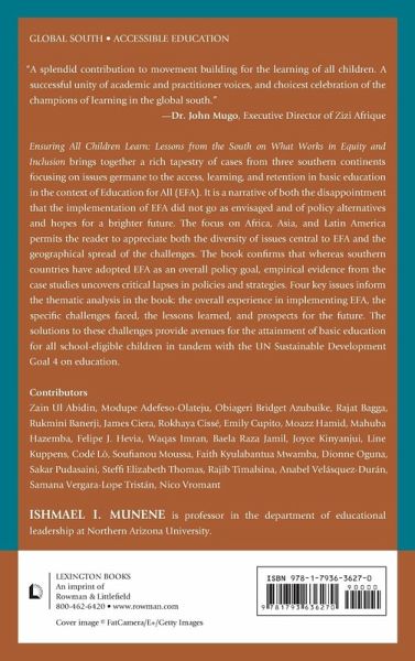 PART 1: FRAMING THE ISSUES Chapter 1: Equity and Inclusion in Education for All: What works in the South Ishmael I. Munene PART 2: CASES FROM AFRICA Chapter 2: Factors Affecting Learning Outcomes of Marginalized Girls in Meru, Laikipia, and Mombasa Counties in Kenya Joyce Kinyanjui Chapter 3: What Age Should Our Children Start Schooling to Optimize on Learning Outcomes James Ciera and Dionne Oguna Chapter 4: Linking Socioeconomic Background to Learning outcomes: New Evidence from Nigeria Bridget Azubuike and Modupe Adefeso-Olateju Chapter 5: How Remediation Helps to Improve Children's Educational Learnings in Primary Education in Senegal Soufianou Moussa, Rokhaya Cissé, and Codé Lô Chapter 6: Scaling Teaching at the Right Level: Insights from the Catch-Up Literacy and Numeracy Intervention in Zambia Nico Vromant, Line Kuppens, Mahuba Hazemba, and Faith Kyulabantua PART 3: FINDINGS FROM ASIA Chapter 7: Evidence-based Decision Making for Policy and Practice: The Case of Pre-Primary in Punjab