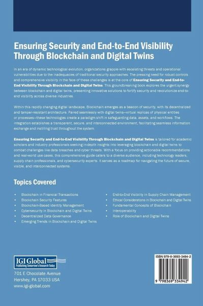 In an era of dynamic technological evolution, organizations grapple with escalating threats and operational vulnerabilities due to the inadequacies of traditional security approaches. The pressing need for robust controls and comprehensive visibility in the face of these challenges is at the core of Ensuring Security and End-to-End Visibility Through Blockchain and Digital Twins . This groundbreaking book explores the urgent synergy between blockchain and digital twins, presenting innovative solutions to fortify security and revolutionize end-to-end visibility across diverse industries. Within this rapidly changing digital landscape, Blockchain emerges as a beacon of security, with its decentralized and tamper-resistant architecture. Paired seamlessly with digital twins-virtual replicas of physical entities or processes-these technologies create a paradigm shift in safeguarding data, assets, and workflows. The integration establishes a transparent, secure, and interconnected environment, facilitating seamless information exchange and instilling trust throughout the system.