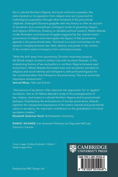 Set in Colonial Northern Nigeria, this book confronts a paradox: the state insisted on its separation from religion even as it governed its multireligious population through what remained of the precolonial caliphate. Entangled Domains grapple with this history to offer a provocative account of secularism as a contested yet contingent mode of governing religion and religious difference. Drawing on detailed archival research, Rabiat Akande vividly illustrates constitutional struggles triggered by the colonial state's governance of religion and interrogates the legacy of that governance agenda in the postcolonial state. This book is a novel commentary on the dynamic interplay between law, faith, identity, and power in the context of the modern state's emergence from colonial processes.