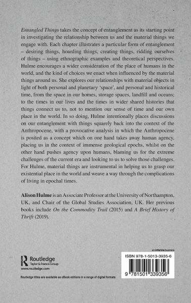 Entangled Things takes the concept of entanglement as its starting point in investigating the relationship between us and the material things we engage with. Each chapter illustrates a particular form of entanglement - desiring things, hoarding things, creating things, ridding ourselves of things - using ethnographic examples and theoretical perspectives. Hulme encourages a wider consideration of the place of humans in the world, and the kind of choices we enact when influenced by the material things around us. She explores our relationships with material objects in light of both personal and planetary 'space', and personal and historical time, from the space in our homes, storage spaces, landfill and oceans; to the times in our lives and the times in wider shared histories that things connect us to, not to mention our sense of time and our own place in the world. In so doing, Hulme intentionally places discussions on our entanglement with things squarely back into the context ofthe Anthropocene, with a provocative analysis in which the Anthropocene is posited as a concept which on one hand takes away human agency, placing us in the context of immense geological epochs, whilst on the other hand pushes agency upon humans, blaming us for the extreme challenges of the current era and looking to us to solve those challenges. For Hulme, material things are instrumental in helping us to grasp our existential place in the world and weave a way through the complications of living in epochal times.