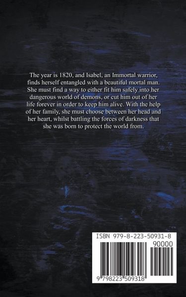 The year is 1820, and Isabel, an Immortal warrior, finds herself entangled with a beautiful mortal man. She must find a way to either fit him safely into her dangerous world of demons, or cut him out of her life forever in order to keep him alive. With the help of her family, she must choose between her head and her heart, whilst battling the forces of darkness that she was born to protect the world from.