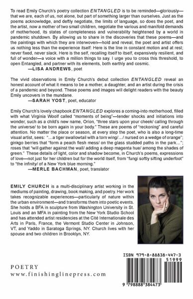 Entangled is a collection of poems by visual artist and poet Emily Church that examines the in-between state of being a daughter and a mother while maintaining autonomy as an artist. Church utilizes metaphors from the natural world to guide us back and forth through time, recalling memories of growing up in Kentucky to raising children in present day post-Pandemic Brooklyn. The poems examine themes of loss, growth, change, and what it means to let go. We are consistently reminded, when reading these words, that the writer is a trained painter, accustomed to sensing the world in a heightened visual way. Color and light permeate the work, and interspersed within the poems are ink paintings created during the early months of pandemic isolation. The drawings of trees and roots enhance the idea that the author is both grounded in her past, while reaching toward a future.