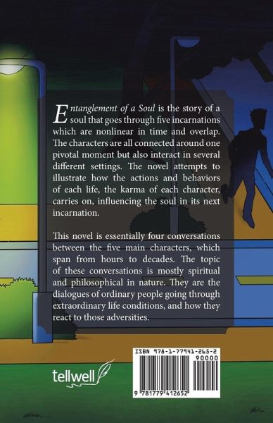 Entanglement of a Soul is the story of a soul that goes through five incarnations which are nonlinear in time and overlap. The characters are all connected around one pivotal moment but also interact in several different settings. The novel attempts to illustrate how the actions and behaviors of each life, the karma of each character, carries on, influencing the soul in its next incarnation. This novel is essentially four conversations between the five main characters, which span from hours to decades. The topic of these conversations is mostly spiritual and philosophical in nature. They are the dialogues of ordinary people going through extraordinary life conditions, and how they react to those adversities.