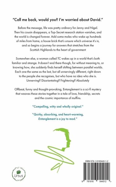 Entanglement is a quirky mystery with a sci-fi twist which reviews say "blends the wit of Douglas Adams with the sci-fi genius of Terry Pratchett" and "If you're a fan of Douglas Adams, Issac Asimov, Kurt Vonnegut or Haruki Murakami you'll definitely love this book too". David's fiancée worries when he drops out of contact. MI5 panics when a secret airbase vanishes. Liz doesn't understand when her research subjects go missing. Nigel is confused when he finds an ordinary house brick floating in thin air. And a woman spends her life shifting between parallel worlds. But how can all these things be connected? And why are cakes so important? Entanglement is a warm, funny, and original tale about friendship, loss and coping when you're out of your depth which also invites readers to ask, "What if?" What if you hadn't answered that voicemail? And what if grass that never needs cutting wasn't being kept secret by the lawnmower companies?