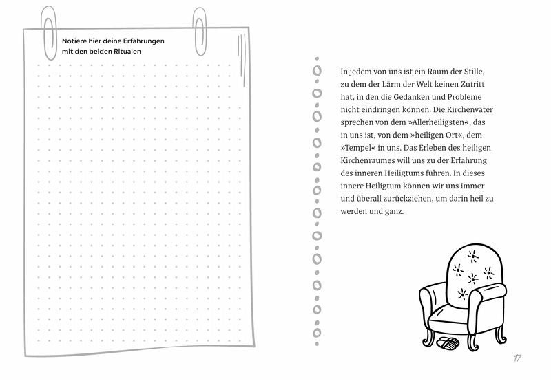"In uns allen gibt es einen heiligen Raum, zu dem Gedanken und Emotionen keinen Zugang haben. Dort sind wir ganz und heil, frei von der Macht der Menschen, von ihren Erwartungen und Ansprüchen, von ihren Verurteilungen und Urteilen. Hier kommen wir in Einklang mit uns selbst."Dieses Buch ist eine Einladung, uns auf die Suche nach diesem Ort in uns zu machen. Es stellt Fragen und gibt Anregungen, die helfen, ihn inmitten unserer Welt zu bewahren.Und schließlich gibt dieses Taschenseminar viel Raum, im Weiterdenken ganz eigene Lösungen und Antworten zu finden. So wird das Buch zu einem wichtigen Wegbegleiter, der zum Wiederlesen, Weiterschreiben und Weiterwachsen einlädt.