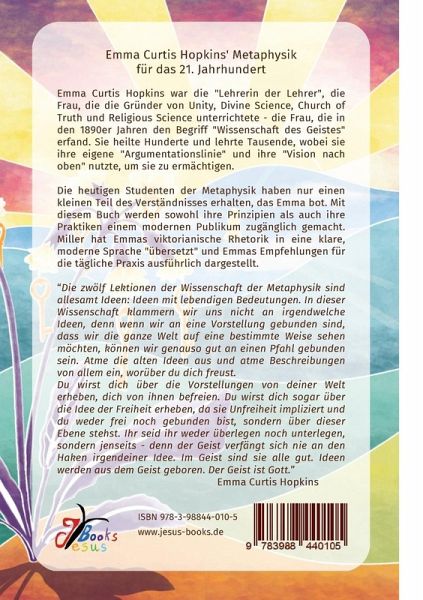 Emma Curtis Hopkins' Metaphysik für das 21. Jahrhundert Emma Curtis Hopkins war die "Lehrerin der Lehrer", die Frau, die die Gründer von Unity, Divine Science, Church of Truth und Religious Science unterrichtete - die Frau, die in den 1890er Jahren den Begriff "Wissenschaft des Geistes" erfand. Sie heilte Hunderte und lehrte Tausende, wobei sie ihre eigene "Argumentationslinie" und ihre "Vision nach oben" nutzte, um sie zu ermächtigen. "Die heutigen Studenten der Metaphysik haben nur einen kleinen Teil des Verständnisses erhalten, das Emma bot. Mit diesem Buch werden sowohl ihre Prinzipien als auch ihre Praktiken einem modernen Publikum zugänglich gemacht. Miller hat Emmas viktorianische Rhetorik in eine klare, moderne Sprache "übersetzt" und Emmas Empfehlungen für die tägliche Praxis ausführlich dargestellt. Die zwölf Lektionen der Wissenschaft der Metaphysik sind allesamt Ideen: Ideen mit lebendigen Bedeutungen. In dieser Wissenschaft klammern wir uns nicht an irgendwelche Ideen, denn wenn wir an eine Vorstellung gebunden sind, dass wir die ganze Welt auf eine bestimmte Weise sehen möchten, können wir genauso gut an einen Pfahl gebunden sein. Atme die alten Ideen aus und atme Beschreibungen von allem ein, worüber du dich freust. Du wirst dich über die Vorstellungen von deiner Welt erheben, dich von ihnen befreien. Du wirst dich sogar über die Idee der Freiheit erheben, da sie Unfreiheit impliziert und du weder frei noch gebunden bist, sondern über dieser Ebene stehst. Ihr seid ihr weder überlegen noch unterlegen, sondern jenseits - denn der Geist verfängt sich nie an den Haken irgendeiner Idee. Im Geist sind sie alle gut. Ideen werden aus dem Geist geboren. Der Geist ist Gott. " Emma Curtis Hopkins Für jedes Kapitel wurde von der Illustratorin Cynthia Maletzki (https://www.cynthia-maletzki.de) liebevoll ein Bild gestaltet. Weitere spirituelle Bücher können unter www.jesus-books.de erworben werden.