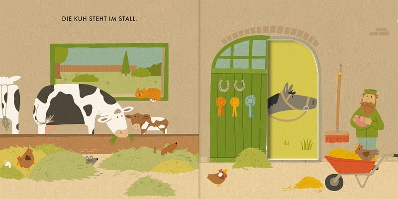 Was die Kuh wohl gerade im Stall macht? Ah, sie wird von der Bäuerin gemolken. Die verschiedenen Stanzformen in dieser Aktivitätspappe führen die kleinen Leser:innen von draußen in den Kuhstall, den Hühnerstall und auf die Pferdekoppel und erweitern ihre räumliche Wahrnehmung. Mit einer klaren und freundlichen Bildsprache haben Kinder ab 18 Monaten Freude am Entdecken von bekannten Formen, Farben und Tieren.
