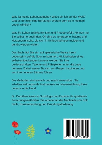Das Buch lädt die Leser ein, auf spielerische Weise ihrem Lebenssinn auf die Spur zu kommen. Sie erhalten eine Schritt-für-Schritt Anleitung, um herauszufinden, was Sie wirklich im Leben wollen. Die Methoden nennt die Autorin selbst-entdeckendes Lernen. Sie sind einfach und rasch anwendbar. Zuallererst zählen Ihre persönlichen Erfahrungen. Das, was Sie wirklich ausmacht, zeigt sich jenseits von Allgemeinplätzen und vorgefertigten Antworten, in Ihrem individuellen Erleben. Aufmerksamkeit und genaues Beobachten sind der Schlüssel zur Selbsterkenntnis. Dabei lassen Sie sich im Buch von Fragen inspirieren und von Ihrer inneren Stimme führen.