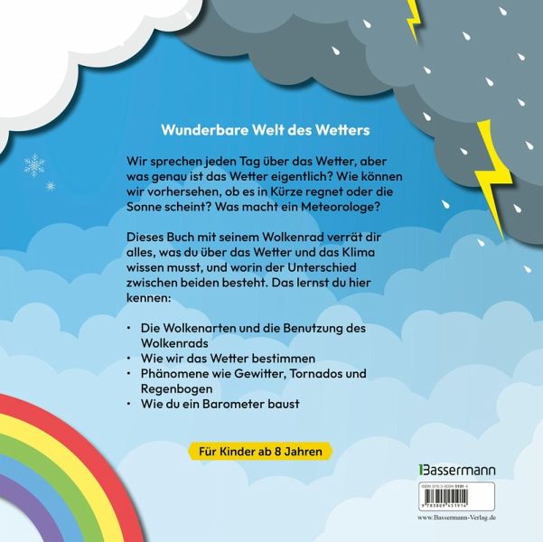 Sei kein Wetterfrosch, sei ein Wetterforscher! Schafe, Blumen, Gesichter - Wolken können die tollsten Formen annehmen. Gleichzeitig sagen sie das Wetter voraus. In diesem reich bebilderten Buch erfahren junge Wetterforscher ab 8 Jahren, was Feder-, Haufen- oder Schichtwolken über die Wetterlage verraten. Auch grundlegendes Wissen über Niederschläge, Temperaturen und Wettervorhersagen wird hier anschaulich vermittelt. Ein Kapitel widmet sich den Wetterextremen wie Gewitter, Stürme oder Überflutungen und liefert zudem eine kurze kindgerechte Einführung in den Klimawandel. Als Besonderheit enthält das Buch eine drehbares Wolkenrad, mit dessen Hilfe die Kinder zehn verschiedene Wolkentypen am Himmel ganz leicht bestimmen können. * Das wichtigste Thema der Welt * Von grundlegenden Wetterbegriffen über Wolkentypen bis zu Extremwetterlagen und einer kindgerechten Einführung in die Aspekte des Klimawandels * Wie kann man das Wetter vorhersagen? Was ist Klimawandel? Wie entstehen Tornados? Können Tiere das Wetter vorhersagen? Wie baue ich mein eigenes Barometer? * Einmalig: Ein drehbares Wolkenrad zur einfachen Bestimmung der zehn häufigsten Wolkentypen und deren Folgen für das aktuelle Wetter * Für Kinder ab 8 Jahren Ausstattung: durchgehend vierfarbige Abbildungen; mit drehbarem Wolkenrad