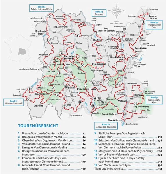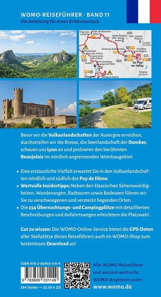 Bevor wir die Vulkanlandschaften der Auvergne erreichen, durchstreifen wir die Bresse, die Seenlandschaft der Dombes, schauen uns Lyon an und probieren den berühmten Beaujolais im nördlich angrenzenden Weinbaugebiet. ¿ Eine erstaunliche Vielfalt erwartet Sie in den Vulkanlandschaften nördlich und südlich des Puy de Dôme. ¿ Wertvolle Insidertipps: Neben den klassischen Sehenswürdigkeiten, Wanderungen, Radtouren sowie Badeseen führen wir Sie zu verschwiegenen und versteckt liegenden Orten. ¿ Die 254 Übernachtungs- und Campingplätze mit detaillierten Beschreibungen und Anfahrtswegen erleichtern die Platzwahl.