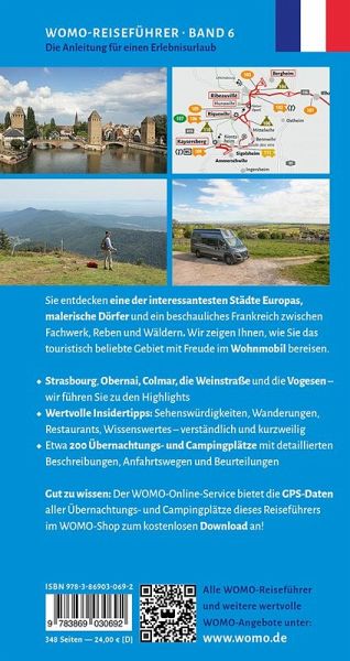 Sie entdecken eine der interessantesten Städte Europas, malerische Dörfer und ein beschauliches Frankreich zwischen Fachwerk, Reben und Wäldern. Wir zeigen Ihnen, wie Sie das touristisch beliebte Gebiet mit Freude im Wohnmobil bereisen. ¿ Strasbourg, Obernai, Colmar, die Weinstraße und die Vogesen - wir führen Sie zu den Highlights ¿ Wertvolle Insidertipps: Sehenswürdigkeiten, Wanderungen, Restaurants, Wissenswertes - verständlich und kurzweilig ¿ Etwa 200 Übernachtungs- und Campingplätze mit detaillierten Beschreibungen, Anfahrtswegen und Beurteilungen