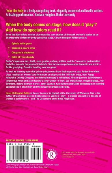 Enter the Body offers a series of provocative case studies of the work women's bodies do on Shakespeare's intensely body-conscious stage. Rutter's topics are sex, death, race, gender, culture, politics, and the excessive performative body that exceeds the playtext it inhabits. As well as drawing upon vital primary documents from Shakespeare's day, Rutter offers close readings of women's performance's on stage and film in Britian today, from Peggy Ashcroft's (white) Cleopatra and Whoopi Goldberg's (whiteface) African Queen to Sally Dexter's languorous Helen and Alan Howard's raver 'Queen' of Troy.