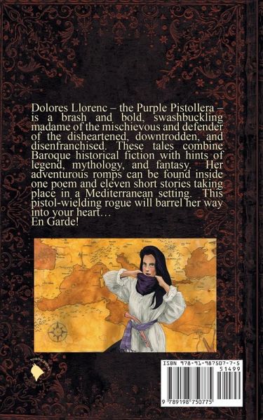 Dolores Llorenc - the Purple Pistollera - is a brash and bold, swashbuckling madame of the mischievous and defender of the disheartened, downtrodden, and disenfranchised. These tales combine Baroque historical fiction with hints of legend, mythology, and fantasy. Her adventurous romps can be found inside one poem and eleven short stories taking place in a Mediterranean setting. This pistol-wielding rogue will barrel her way into your heart...En Garde!