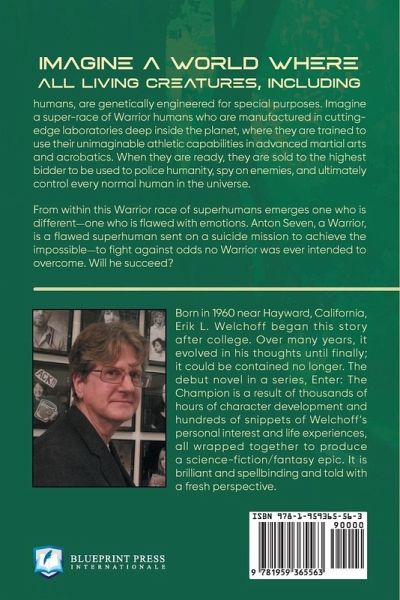 Imagine A World Where ALL LIVING CREATURES, INCLUDING humans, are genetically engineered for special purposes. Imagine a super-race of Warrior humans who are manufactured in cutting-edge laboratories deep inside the planet, where they are trained to use their unimaginable athletic capabilities in advanced martial arts and acrobatics. When they are ready, they are sold to the highest bidder to be used to police humanity, spy on enemies, and ultimately control every normal human in the universe. From within this Warrior race of superhumans emerges one who is different-one who is flawed with emotions. Anton Seven, a Warrior, is a flawed superhuman sent on a suicide mission to achieve the impossible-to fight against odds no Warrior was ever intended to overcome. Will he succeed? Born in 1960 near Hayward, California, Erik L. Welchoff began this story after college. Over many years, it evolved in his thoughts until finally; it could be contained no longer. The debut novel in a series, Enter: The Champion is a result of thousands of hours of character development and hundreds of snippets of Welchoff's personal interest and life experiences, all wrapped together to produce a science-fiction/fantasy epic. It is brilliant and spellbinding and told with a fresh perspective.