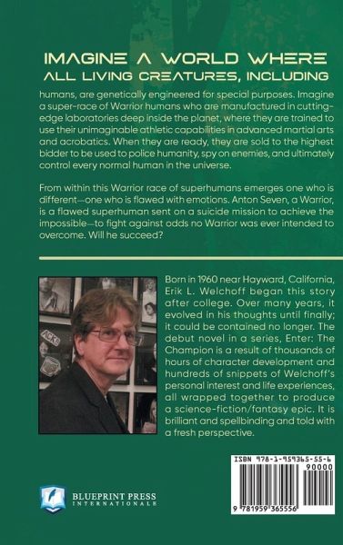 Imagine A World Where ALL LIVING CREATURES, INCLUDING humans, are genetically engineered for special purposes. Imagine a super-race of Warrior humans who are manufactured in cutting-edge laboratories deep inside the planet, where they are trained to use their unimaginable athletic capabilities in advanced martial arts and acrobatics. When they are ready, they are sold to the highest bidder to be used to police humanity, spy on enemies, and ultimately control every normal human in the universe. From within this Warrior race of superhumans emerges one who is different-one who is flawed with emotions. Anton Seven, a Warrior, is a flawed superhuman sent on a suicide mission to achieve the impossible-to fight against odds no Warrior was ever intended to overcome. Will he succeed? Born in 1960 near Hayward, California, Erik L. Welchoff began this story after college. Over many years, it evolved in his thoughts until finally; it could be contained no longer. The debut novel in a series, Enter: The Champion is a result of thousands of hours of character development and hundreds of snippets of Welchoff's personal interest and life experiences, all wrapped together to produce a science-fiction/fantasy epic. It is brilliant and spellbinding and told with a fresh perspective.
