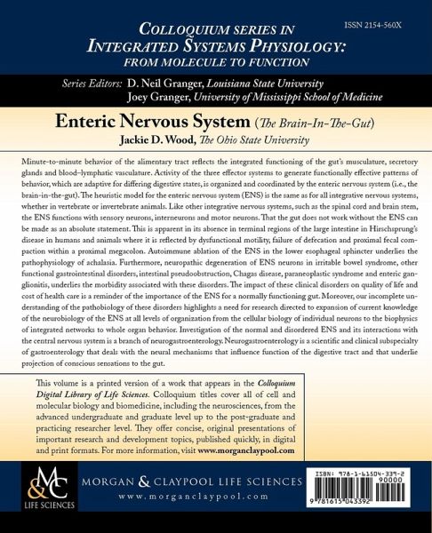 Minute-to-minute behavior of the alimentary tract reflects the integrated functioning of the gut's musculature, secretory glands and blood-lymphatic vasculature. Activity of the three effector systems to generate functionally effective patterns of behavior, which are adaptive for differing digestive states, is organized and coordinated by the enteric nervous system (i.e., the brain-in-the-gut). The heuristic model for the enteric nervous system (ENS) is the same as for all integrative nervous systems, whether in vertebrate or invertebrate animals. Like other integrative nervous systems, such as the spinal cord and brain stem, the ENS functions with sensory neurons, interneurons and motor neurons. That the gut does not work without the ENS can be made as an absolute statement. This is apparent in its absence in terminal regions of the large intestine in Hirschsprung's disease in humans and animals where it is reflected by dysfunctional motility, failure of defecation and proximal fecal compaction within a proximal megacolon. Autoimmune ablation of the ENS in the lower esophageal sphincter underlies the pathophysiology of achalasia. Furthermore, neuropathic degeneration of ENS neurons in irritable bowel syndrome, other functional gastrointestinal disorders, intestinal pseudoobstruction, Chagas disease, paraneoplastic syndrome and enteric ganglionitis, underlies the morbidity associated with these disorders. The impact of these clinical disorders on quality of life and cost of health care is a reminder of the importance of the ENS for a normally functioning gut. Moreover, our incomplete understanding of the pathobiology of these disorders highlights a need for research directed to expansion of current knowledge of the neurobiology of the ENS at all levels of organization from the cellular biology of individual neurons to the biophysics of integrated networks to whole organ behavior. Investigation of the normal and disordered ENS and its interactions with the central nervous system is a branch of neurogastroenterology. Neurogastroenterology is a scientific and clinical subspecialty of gastroenterology that deals with the neural mechanisms that influence function of the digestive tract and that underlie projection of conscious sensations to the gut. Table of Contents: Introduction / Historical Perspective / Heuistic Model / Microanatomy / Sensory Neurophysiology / Interneurons / Enteric Motor Neurons / Disinhibitory Motor Disorders / Neuronal Electrical Behavior / Synaptic Transmission / Organ Level Integration / Gastric Motor Integration / Integrated Control of the Small and Large Intestines / Plasticity in the ENS / Small Intestine Motility / Defecation / References